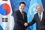 By UN Journal Lee Jon-young President Lee Jae-myung met with U.N. Secretary-General Antonio Guterres on Sept. 23 and asked for the U.N.'s support for South Korea's initiative to achieve North Korea's denuclearization through dialogue, the Presidential office said. Their meeting took place after President Lee declared at the UN that "South Korea will fulfill its responsibility and role to end the Cold War on the Korean Peninsula and contribute to global peace and prosperity through the 'E (Exchange), N (Normalization), and D (Denuclearization) Initiative." President Lee stated, “Peace and secur