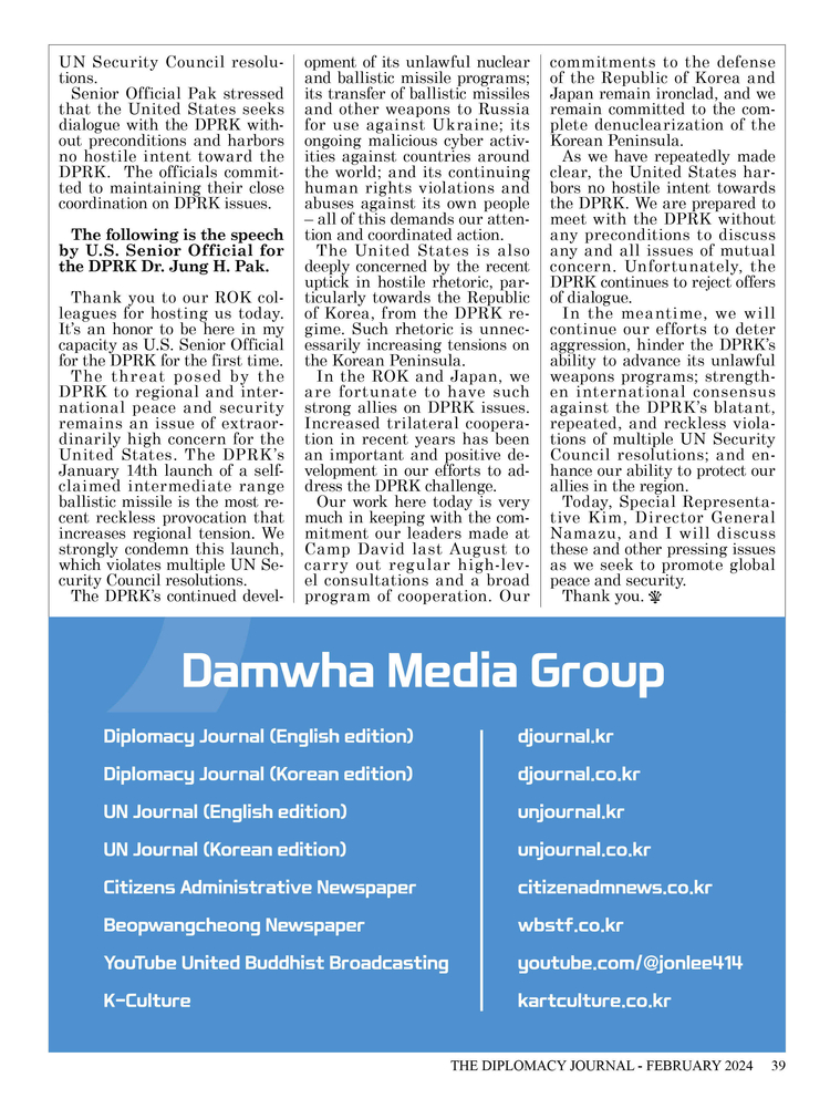 Address: Doosan We've Pavilion 1203, Sambong-ro 81, Jongno-gu, Seoul Date of first registration: Founded in 1996 as UN News, discontinued in 2009 Registration No.: Jongno Ra00610 Registration Date: Reissued on Sept. 18, 2023 Publisher: Damwha Media Group Chairman Lee Jon-young Editor in Chief: Lee Jon-young/ Vice Chairman: Chung Bo-won/Standing Advisor Lee Keon-chan | Senior Editorial Writer Ko Jae-hwe/ Cultural Editor Lee Joon-seok/ Political Editor: Kayla Lee Phone number: 02-3417-1010 | 02-396-5757 E-Mail: djournal3417@gmail.com