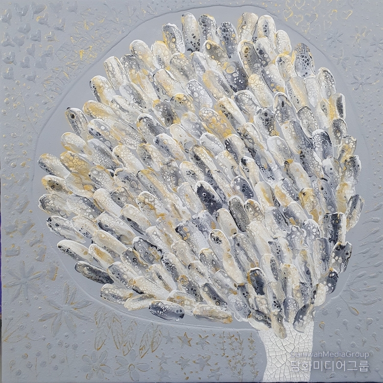 Hundreds and thousands of pieces of acrylic paint are made and glued together. The artist repeatedly increases the density by drawing and scraping the base. The representation of cracks is a metaphor for the source of existence, such as the starting point, the earth, and the mother's womb.