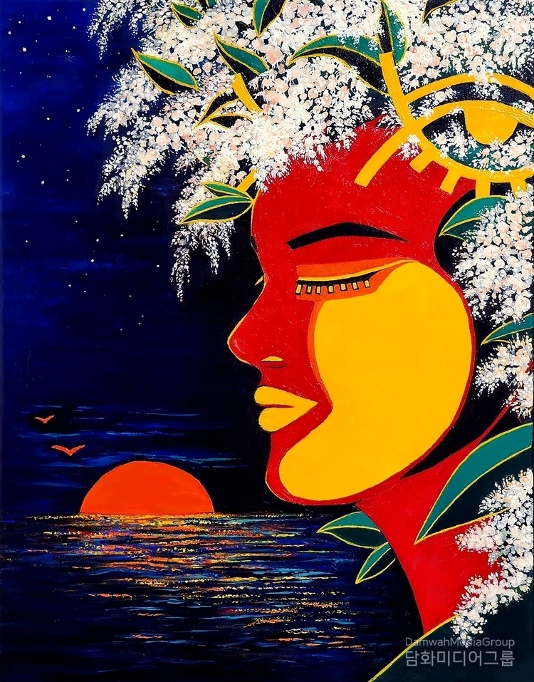 A: The second piece is an oil painting titled "Myth of the Genesis." It depicts the first day of creation, showing the primordial goddess in meditation after completing the creation. The face of the goddess was inspired by a woman from the Ghanaian Ashanti tribe. A white flower above her head is painted using texture techniques to represent the Retusa Fringe Tree flower, symbolizing abundance and prosperity in Korea. The painting features new life budding, a red bird basking in the sunlight, heralding a new era, and conveying hope and vitality for the future of both nations. By integrating cultural elements from Korea and Ghana, the work metaphorically represents the universal interconnectedness inherent in Abode Santann.