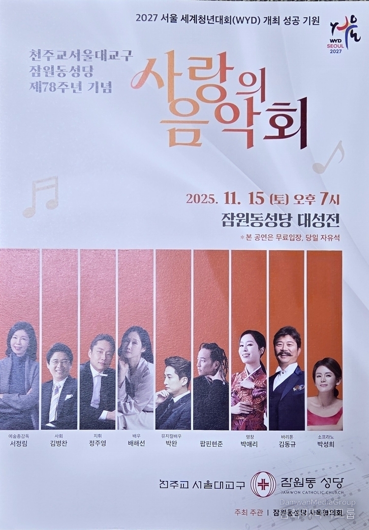 Praying for the successful hosting of the 2027 World Youth Day in Seoul, the ‘Concert of Love’ commemorating the 78th anniversary of the establishment of Jamwon-dong Cathedral of the Catholic Archdiocese of Seoul will be held on the evening of November 15 in the main sanctuary.